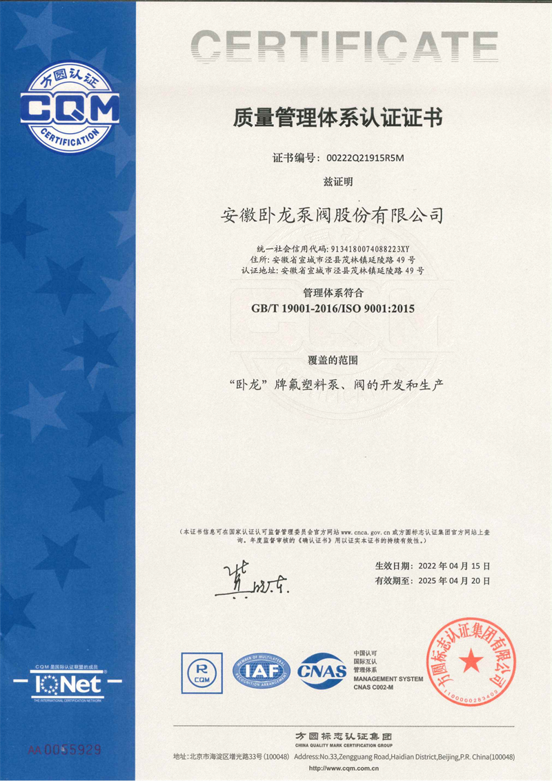 安徽臥龍泵閥股份有限公司位于風景秀麗的江南古鎮(zhèn)——安徽省涇縣茂林鎮(zhèn)。公司前身涇縣氟塑料制品廠創(chuàng)建于1985年,是國內較早引進中科院上海有機化學研究所專利材料——"氟塑料合金",并以此耐腐蝕材料專業(yè)生產制造化工泵、閥、襯氟管道等產品的企業(yè)。公司經(jīng)過歷次的改制變革,2015年更名為安徽臥龍泵閥股份有限公司。